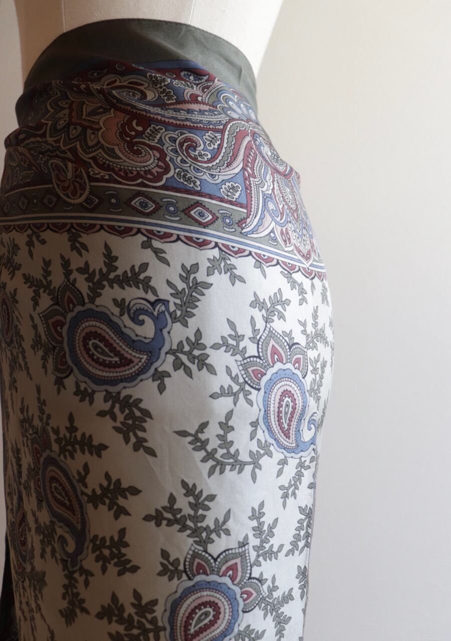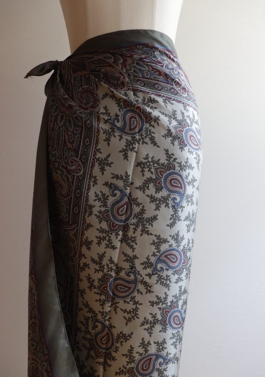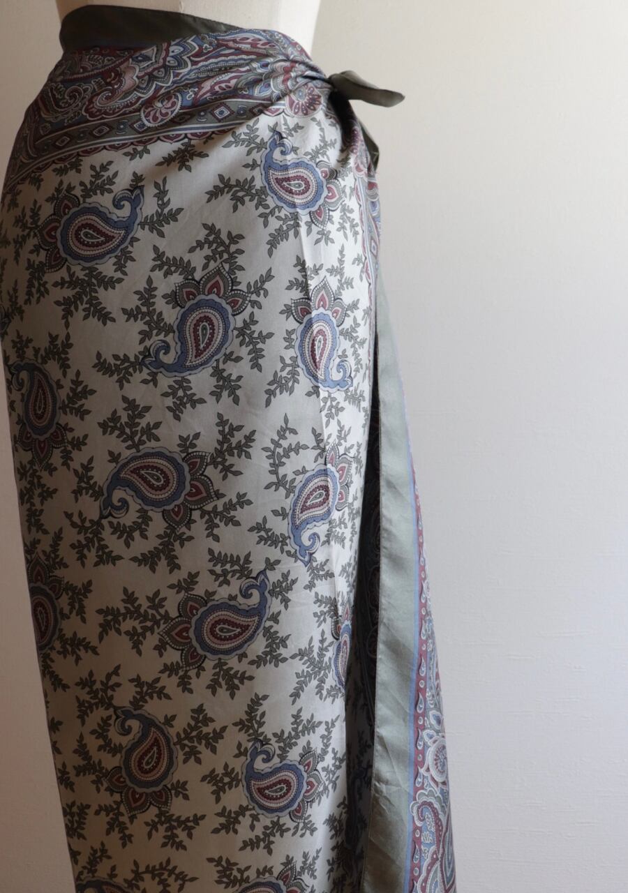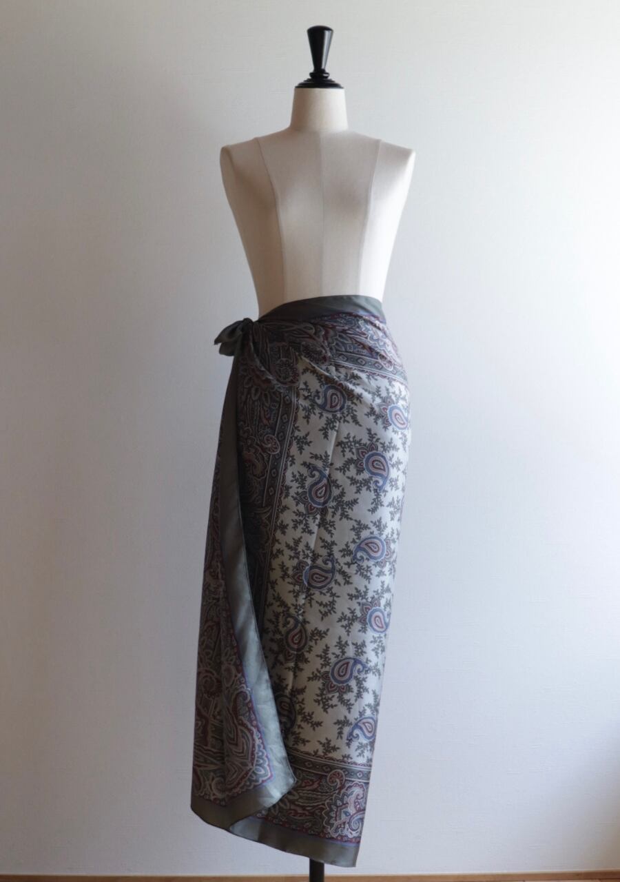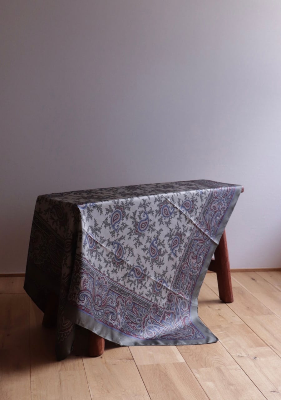 柔らかくしなやかで肌触りの良いシルク生地。透け感は無し。ほどよいシルクの艶が上品で落ち着いた色味も相まって大人の女性にぴったりのアイテム。リュームを楽しんでいただける大判なのも嬉しい。上品でカッコ良く決まるアイテムで季節を問わず活躍してくれるアイテム。ダメージもなくたいへんおすすめの一枚。