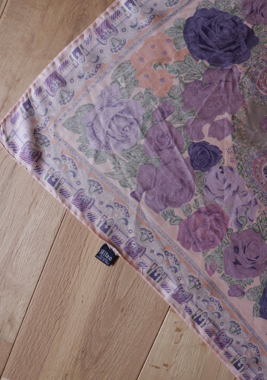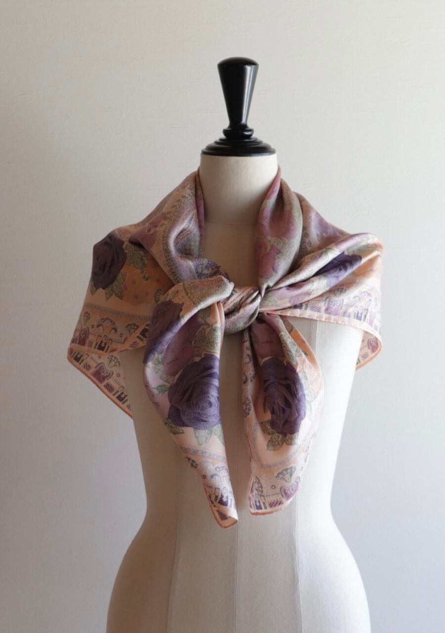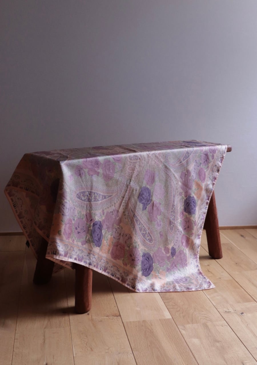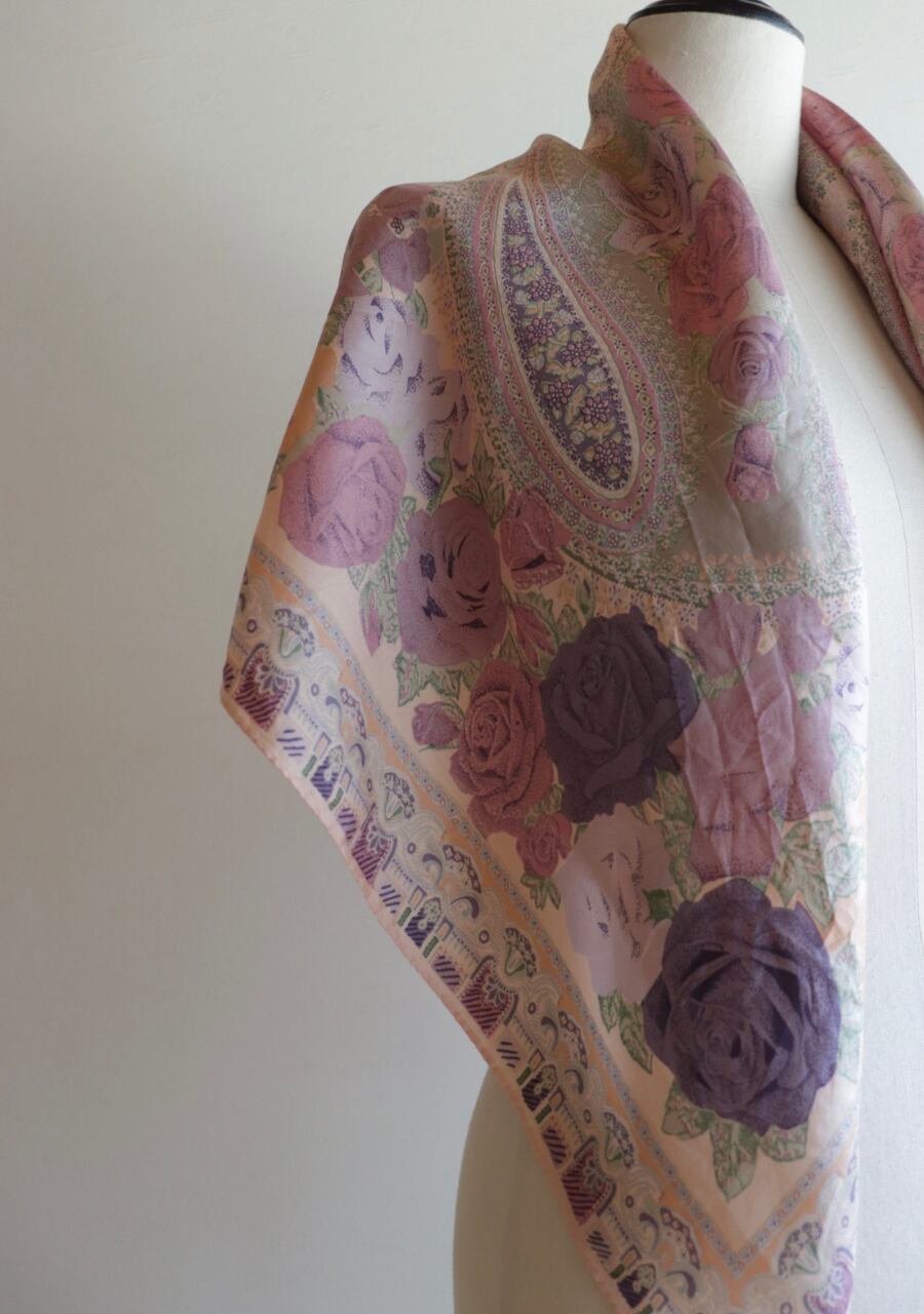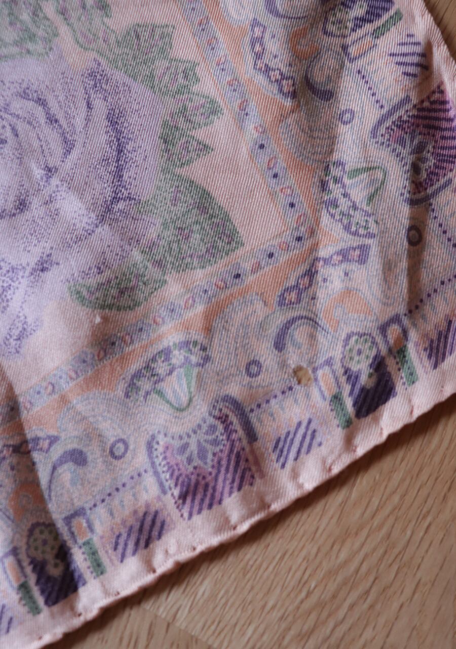柔らかくしなやかで肌触りの良い薄手のシルク生地。透け感は無し。たいへん繊細で上品な艶はシルクならではの素材の良さを感じる一枚。色味も大変素敵で大人の女性にぴったりのカラー。優しい印象でスタイリングに優しさと癒しをプラス。甘すぎないニュアンスカラーがよい。キズがありますが大変素敵な一枚です。可愛くておしゃれ。