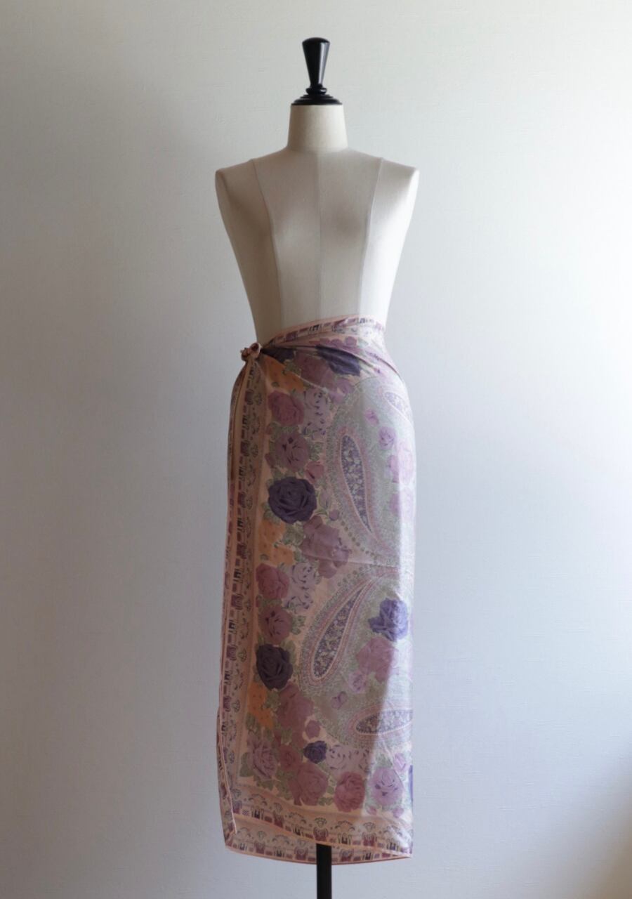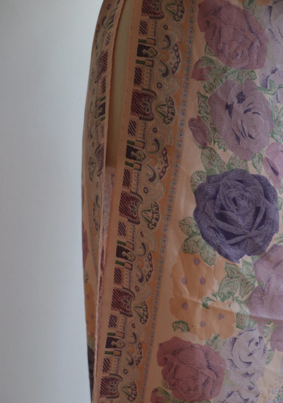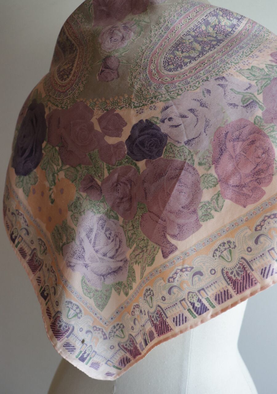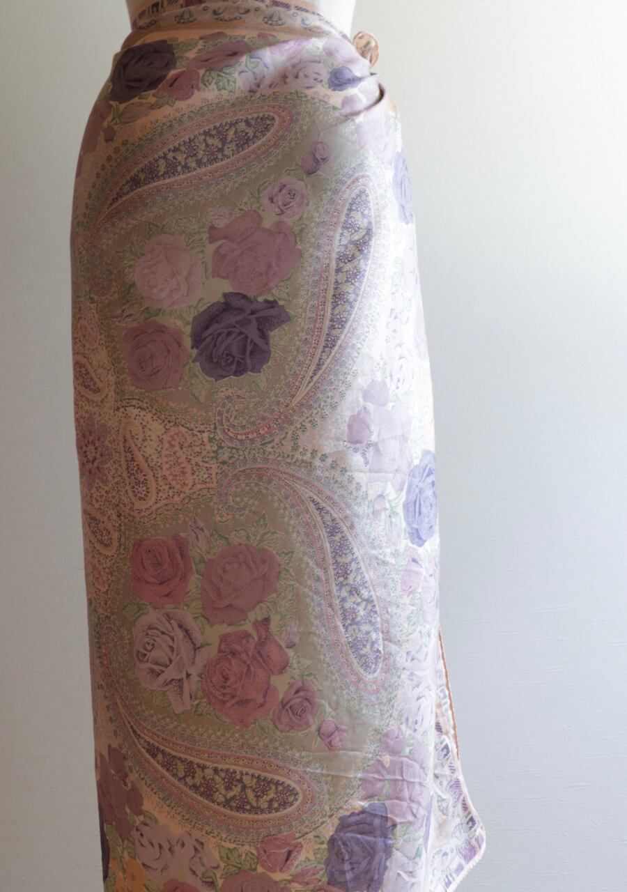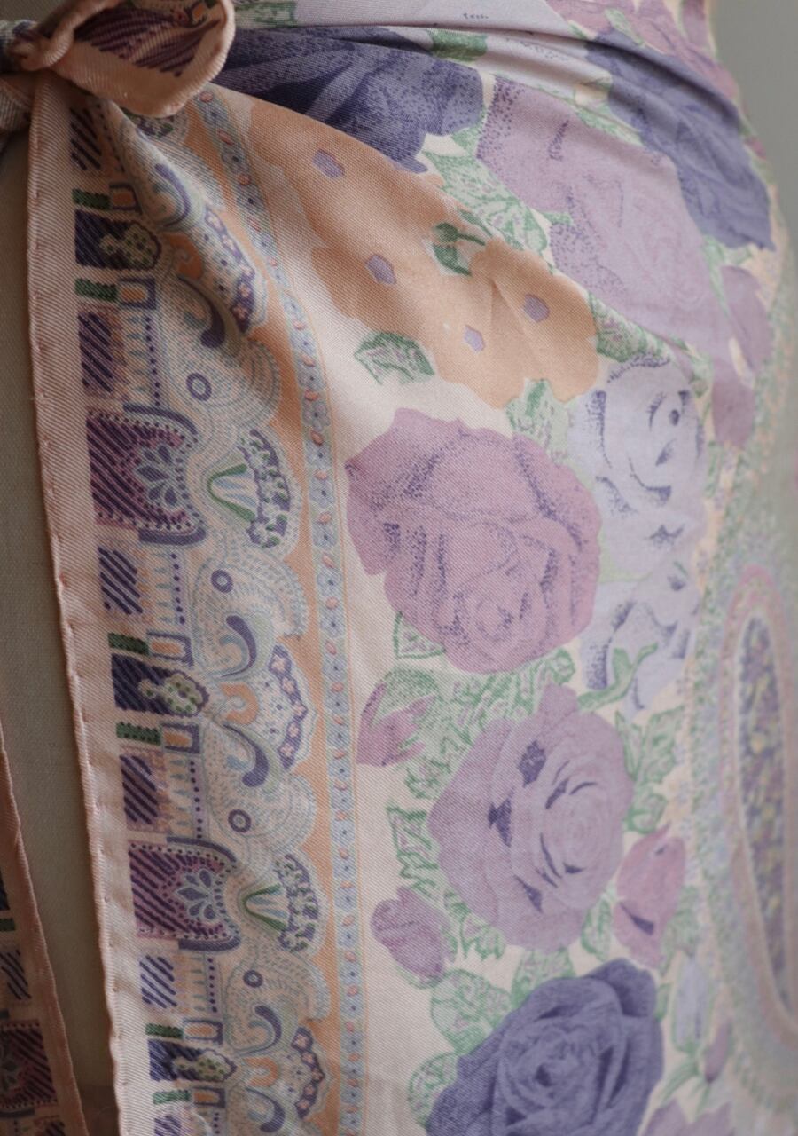 柔らかくしなやかで肌触りの良い薄手のシルク生地。透け感は無し。たいへん繊細で上品な艶はシルクならではの素材の良さを感じる一枚。色味も大変素敵で大人の女性にぴったりのカラー。優しい印象でスタイリングに優しさと癒しをプラス。甘すぎないニュアンスカラーがよい。キズがありますが大変素敵な一枚です。可愛くておしゃれ。
