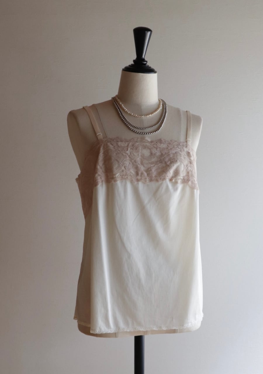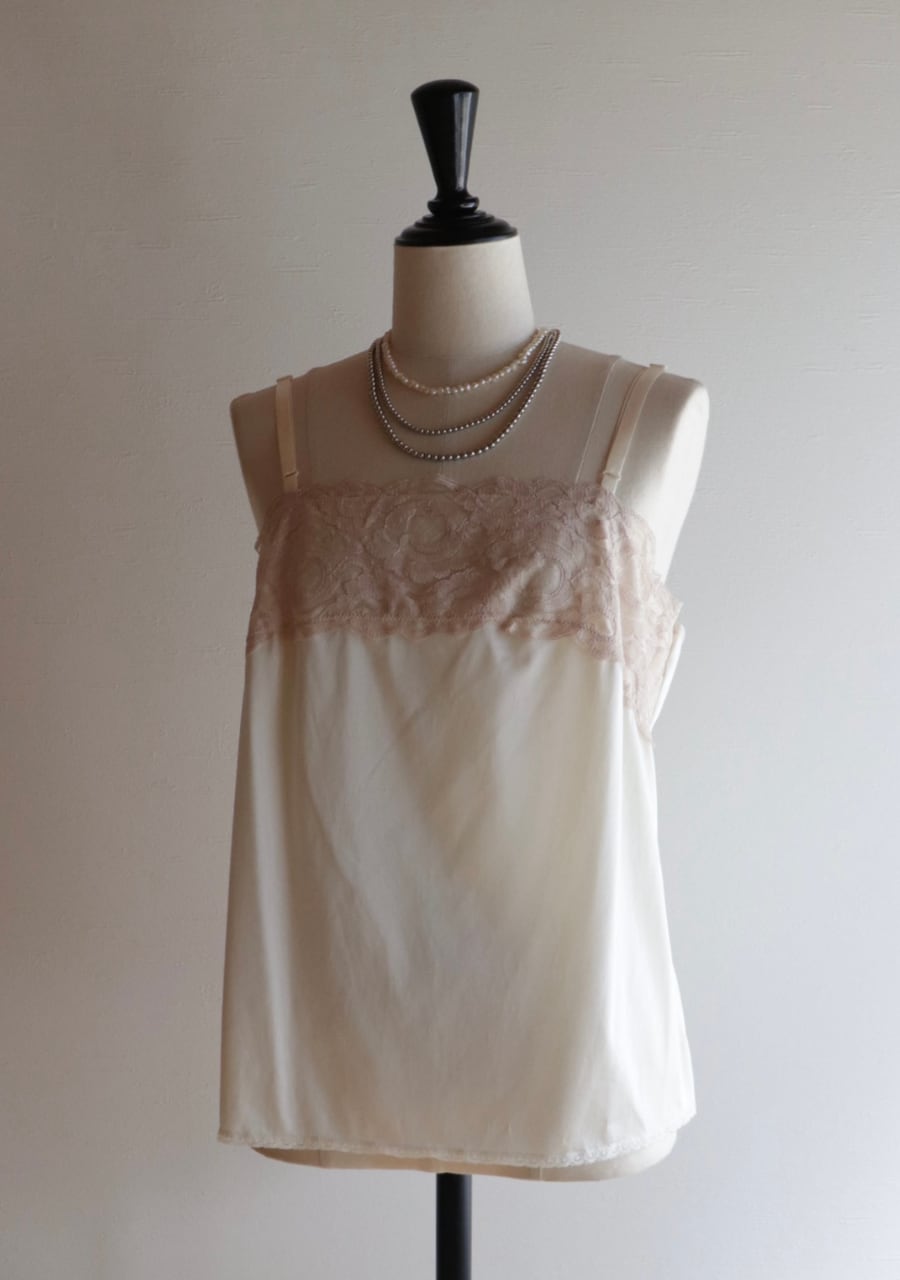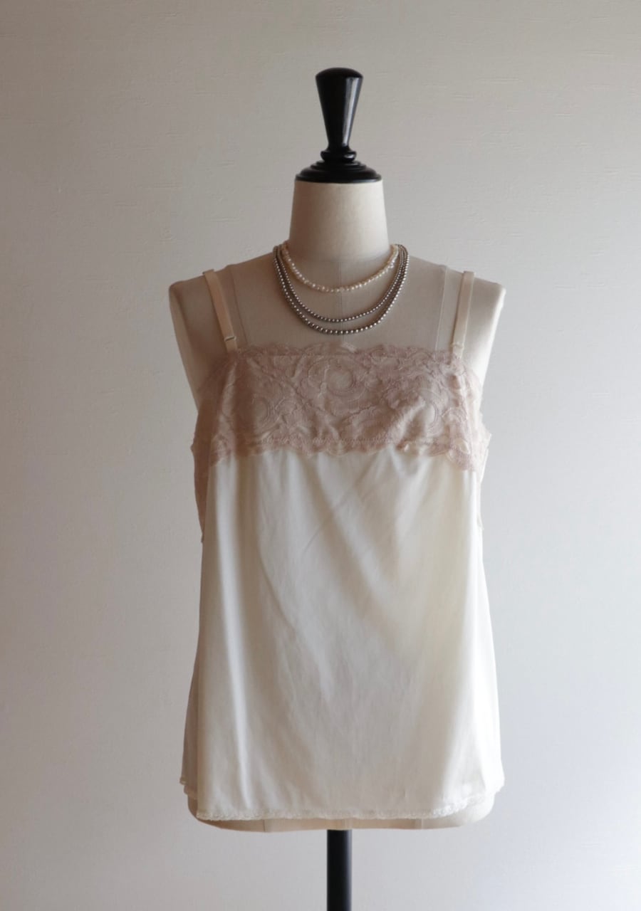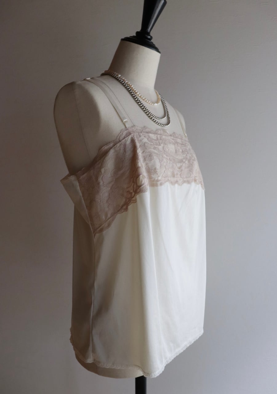 やや伸縮性のあるサテン生地で透け感は無し。程よいサテンの艶に胸元の幅のあるレースがポイント。胸元が開きすぎることないのが嬉しい。腰回りも程よいゆとりでボディーラインを拾わない。レイヤードスタイルやインナーに忍ばせるも良し。胸元のレースが女性らしさを演出しスタイリングに華やかさをプラス。色味も優しく素敵です。