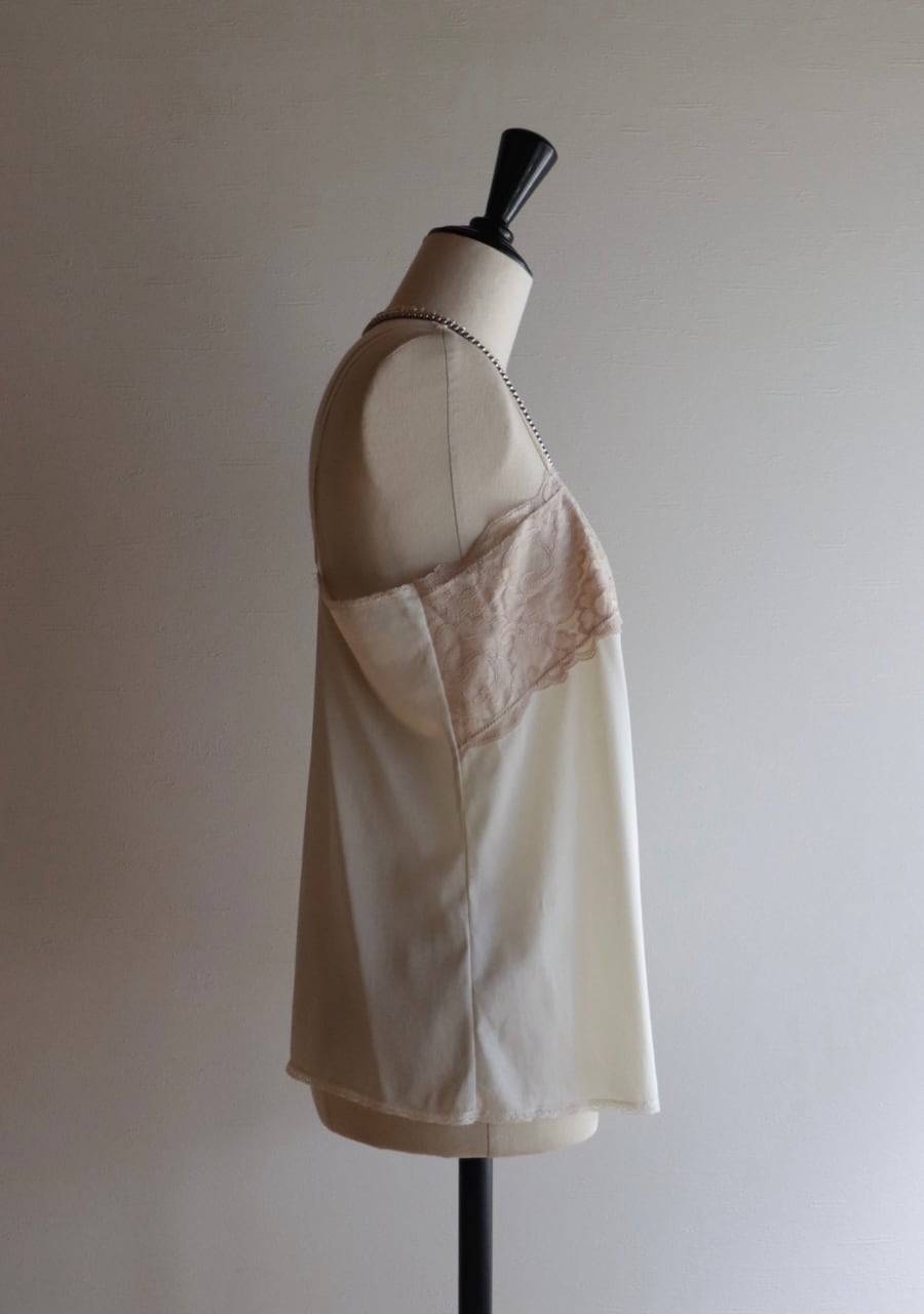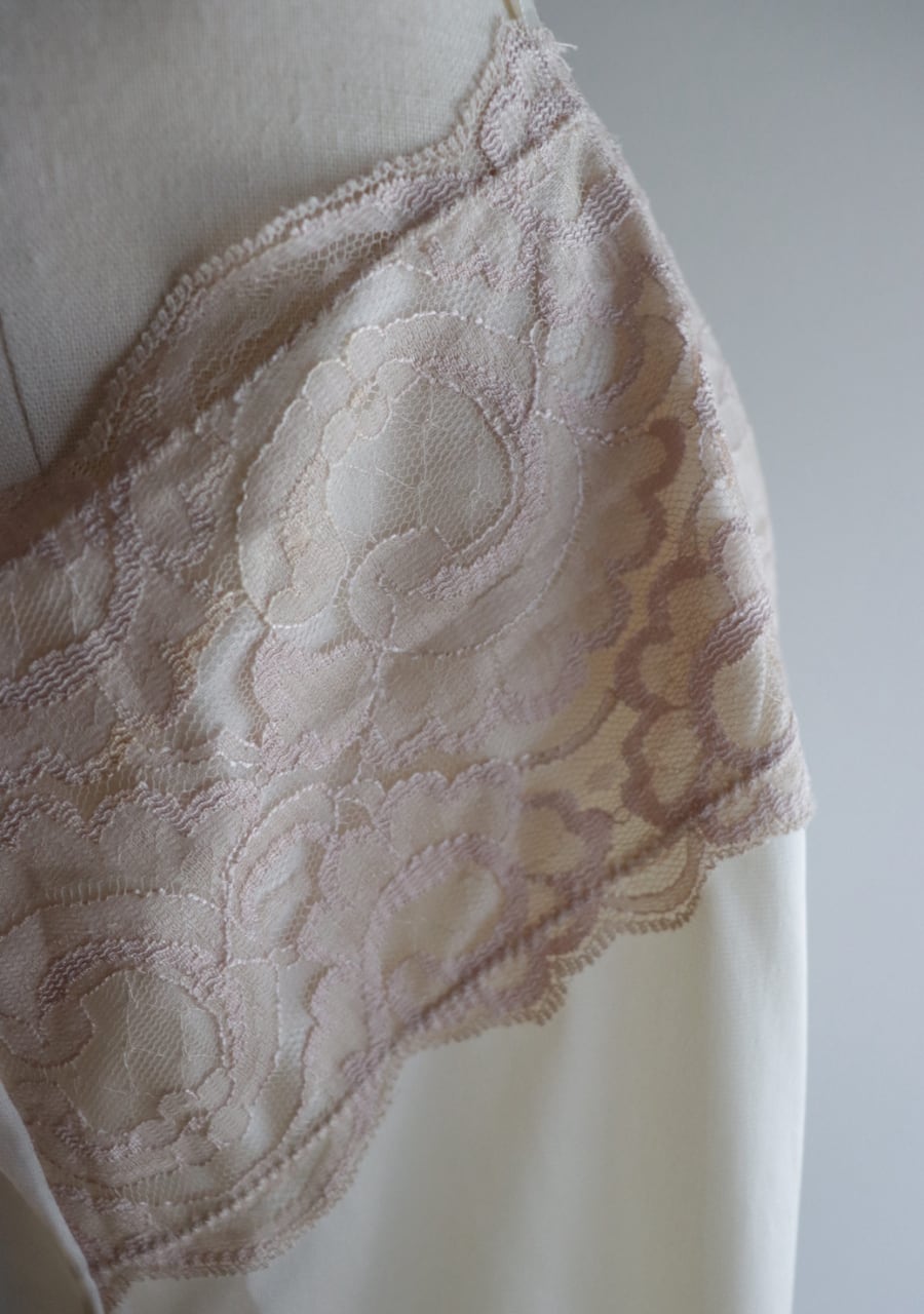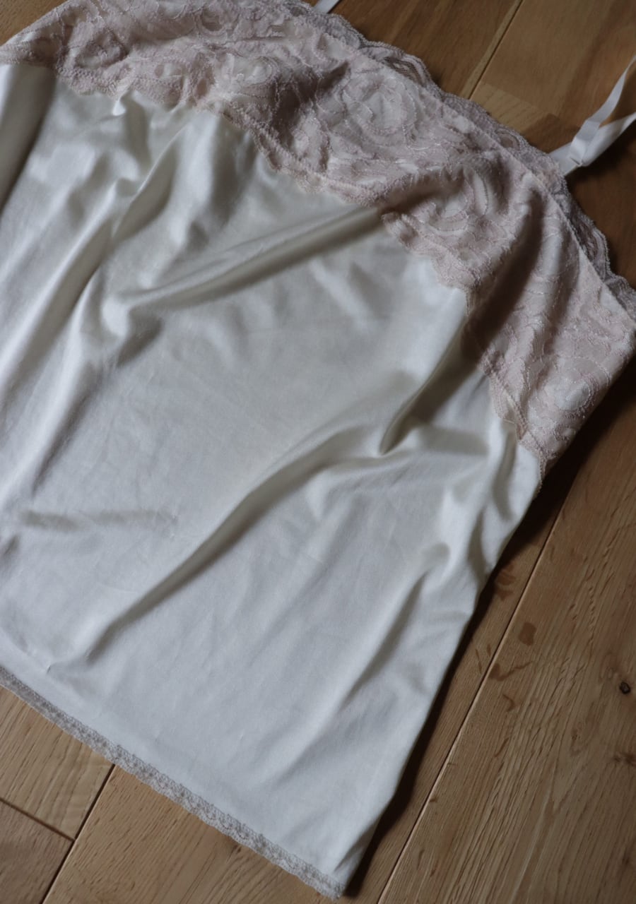 やや伸縮性のあるサテン生地で透け感は無し。程よいサテンの艶に胸元の幅のあるレースがポイント。胸元が開きすぎることないのが嬉しい。腰回りも程よいゆとりでボディーラインを拾わない。レイヤードスタイルやインナーに忍ばせるも良し。胸元のレースが女性らしさを演出しスタイリングに華やかさをプラス。色味も優しく素敵です。