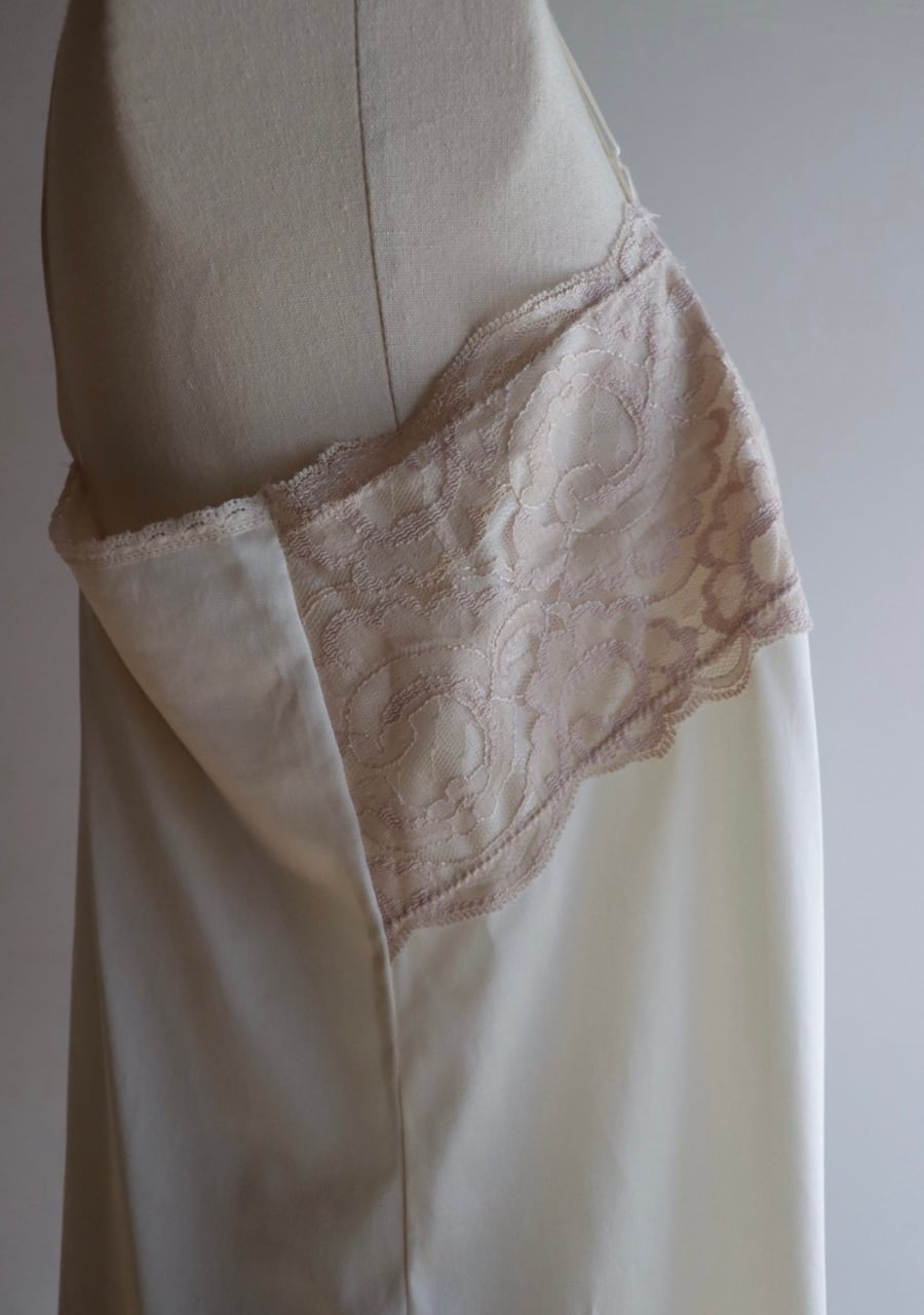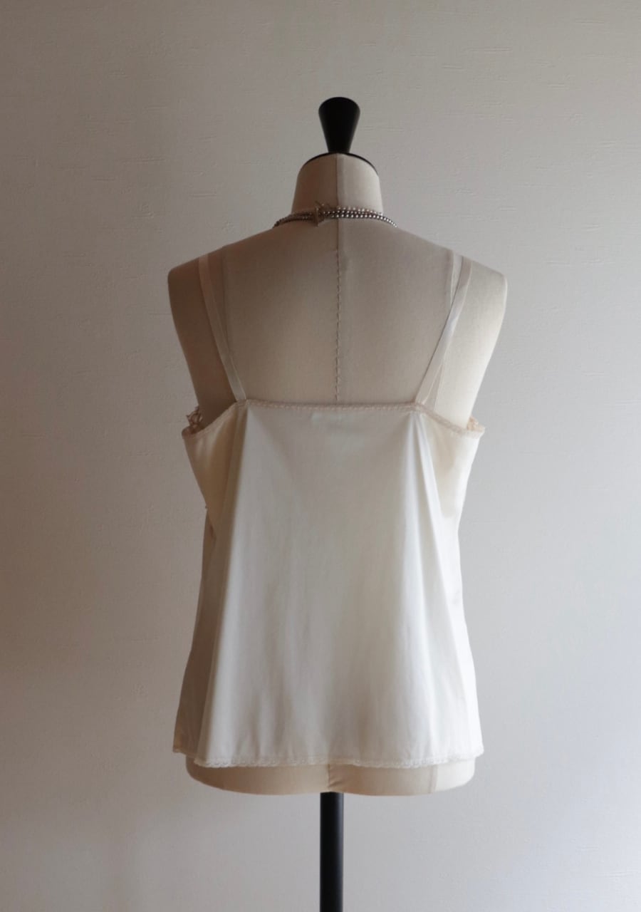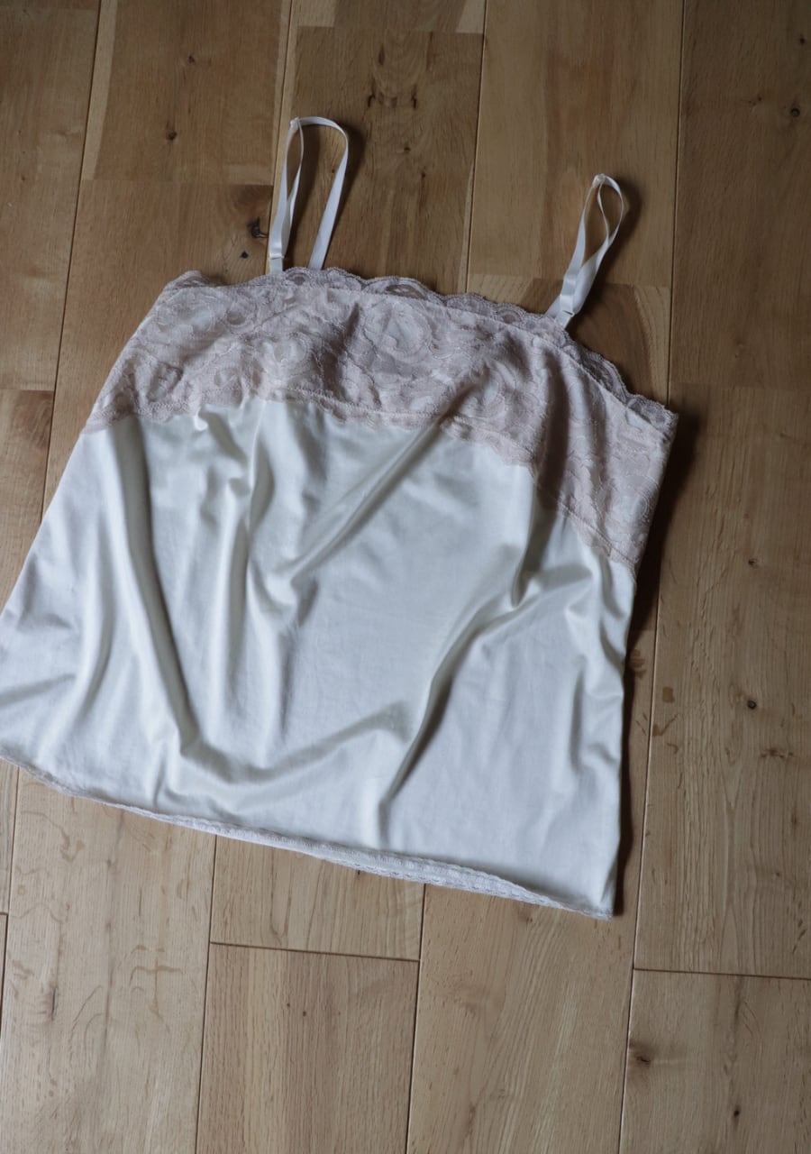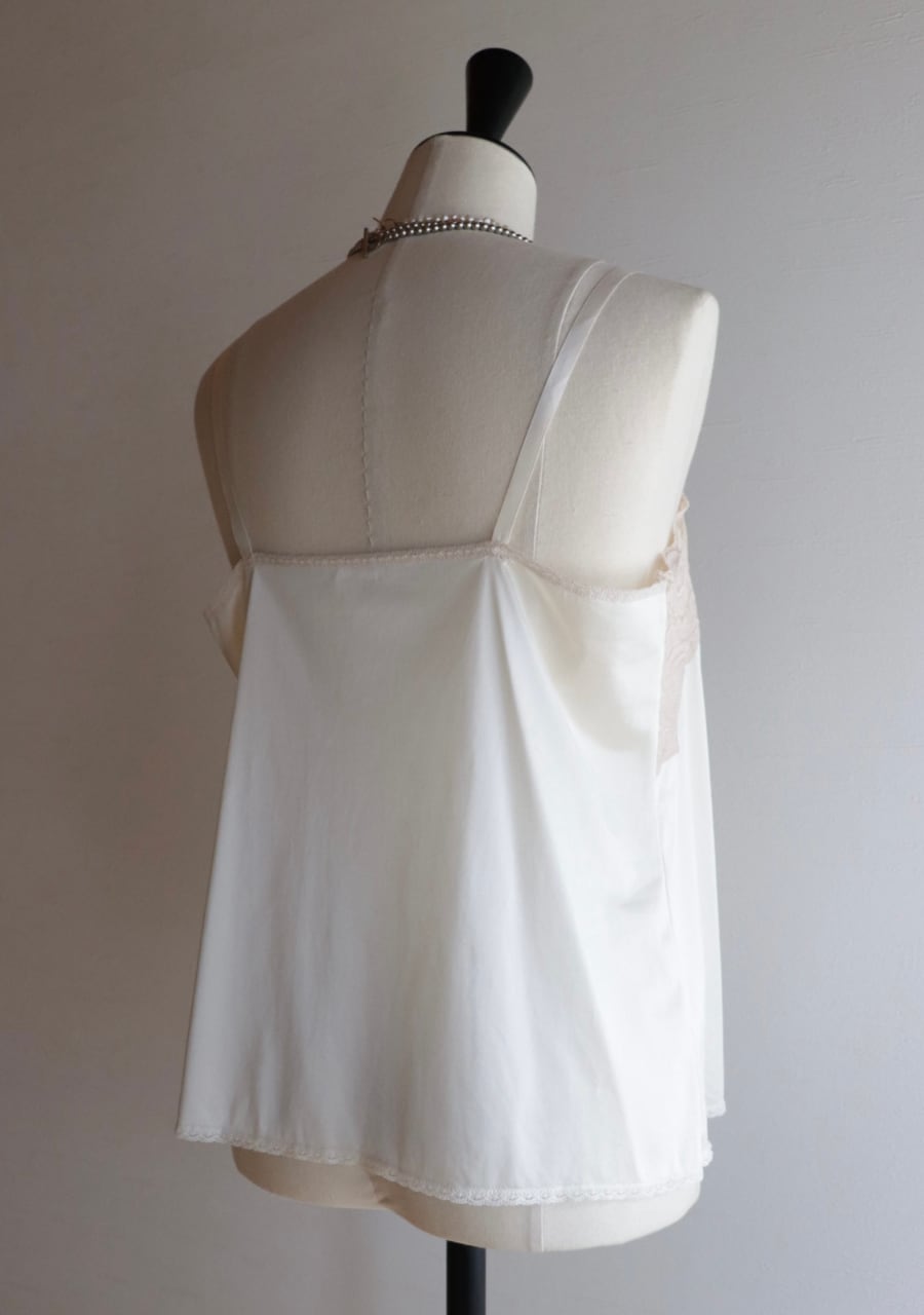 やや伸縮性のあるサテン生地で透け感は無し。程よいサテンの艶に胸元の幅のあるレースがポイント。胸元が開きすぎることないのが嬉しい。腰回りも程よいゆとりでボディーラインを拾わない。レイヤードスタイルやインナーに忍ばせるも良し。胸元のレースが女性らしさを演出しスタイリングに華やかさをプラス。色味も優しく素敵です。
