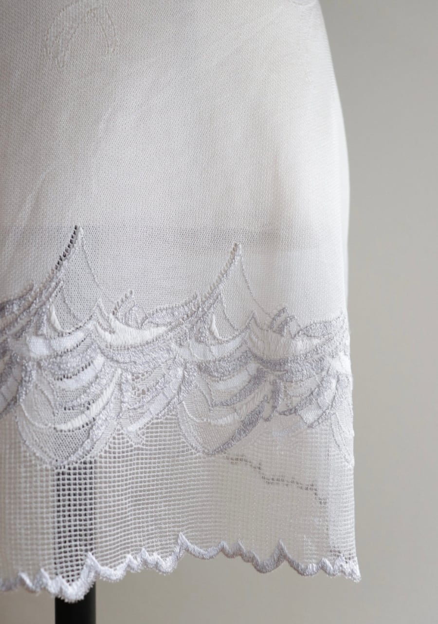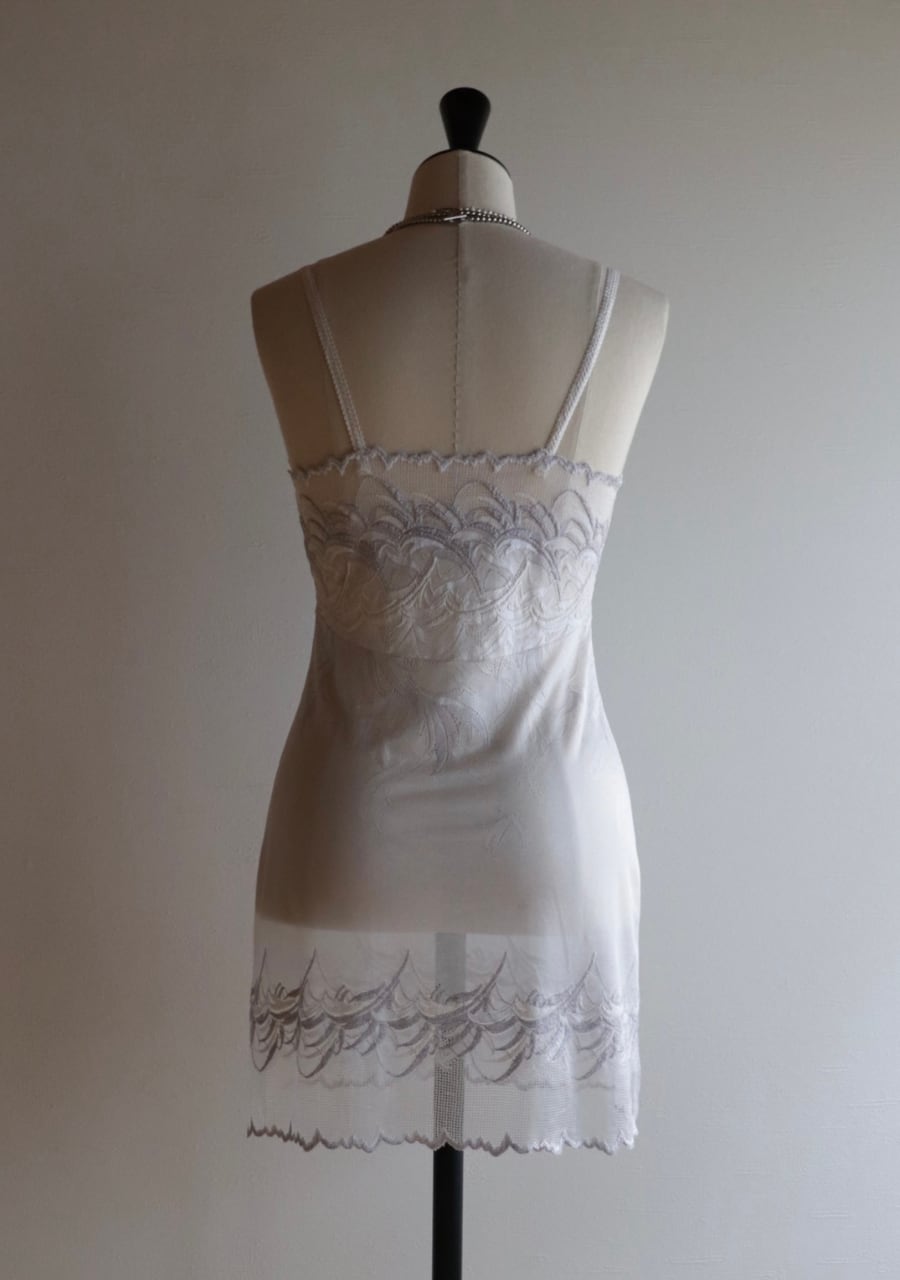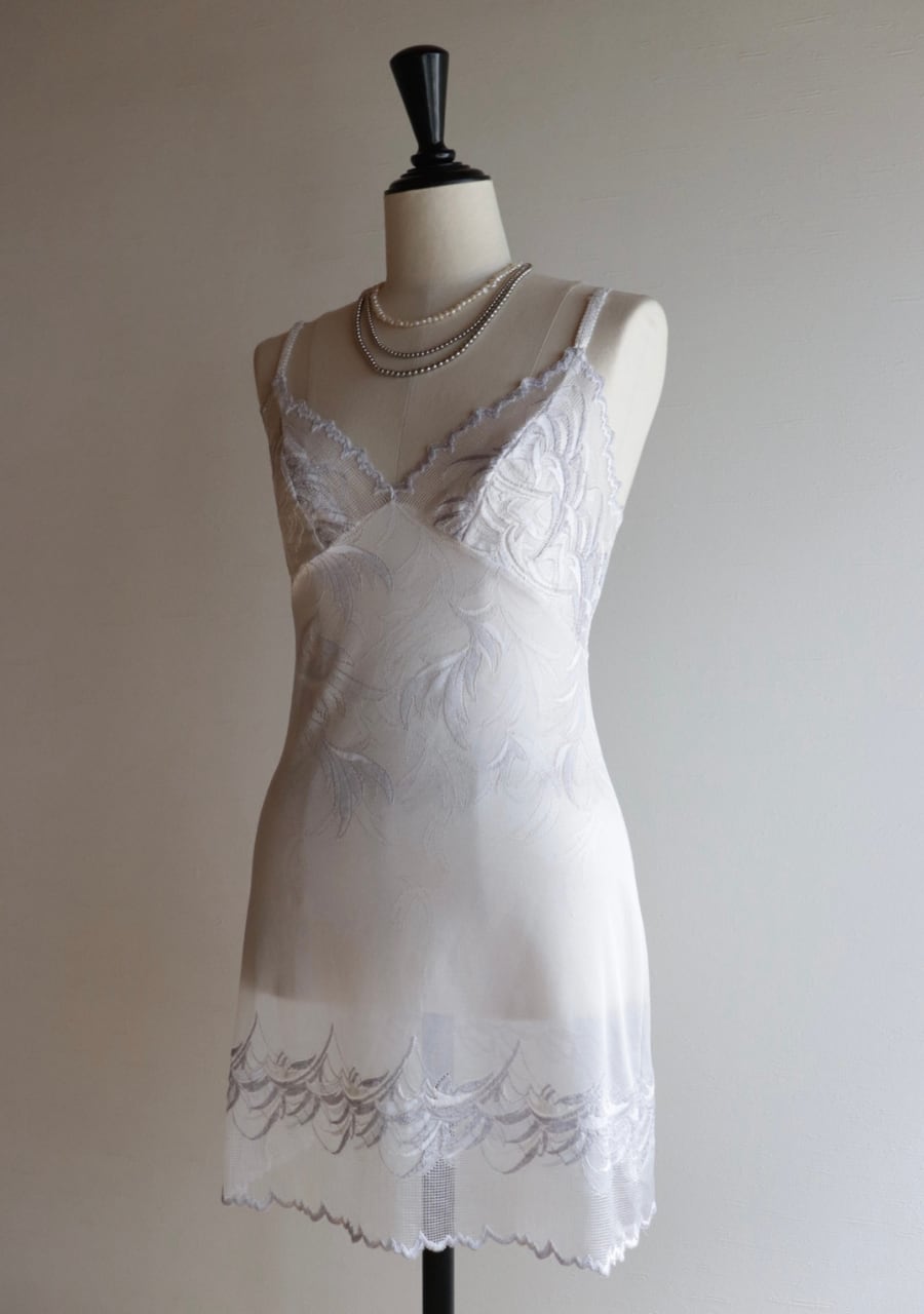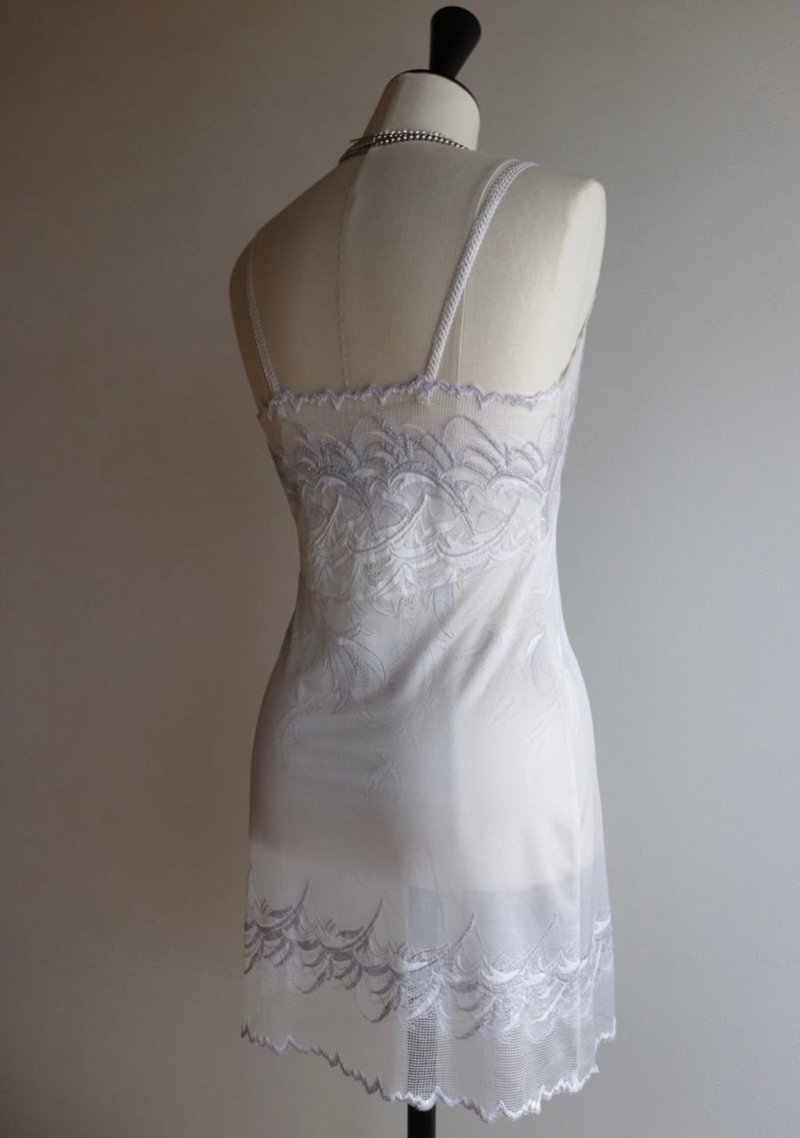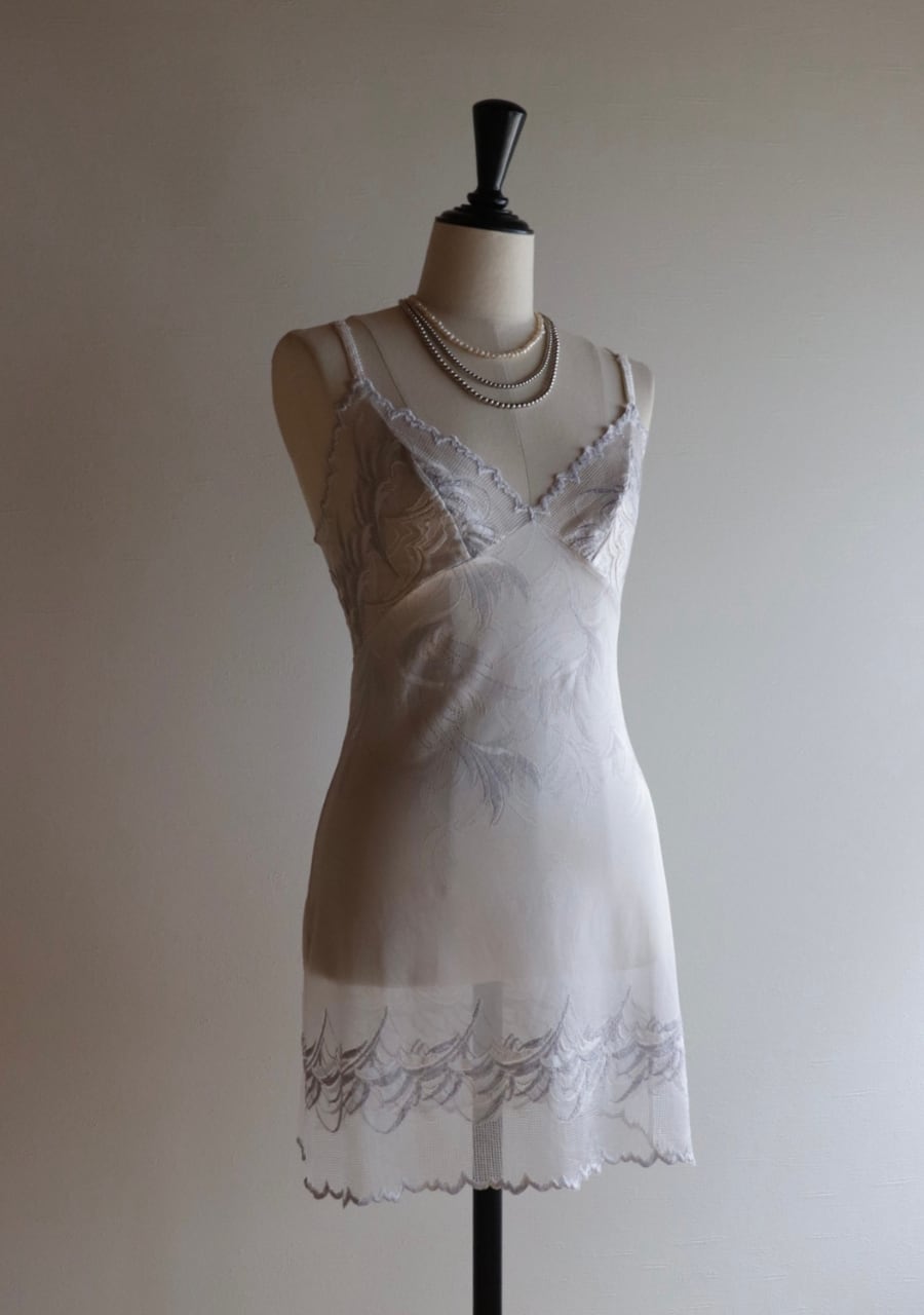 伸縮性があり透け感のある生地。レースにバリエーションがあり一枚に込められた素敵なスリップ。色味も良く刺繍もクールな印象。伸縮性が高く体のラインに綺麗に添ってくれます。透け感のある生地はレイヤードでインナーの色味と楽しんてスタイリングすることが可能。奥行きのあるスタイリングを楽しめます。着丈も程よく可愛い。女性らしさと華やかさをプラスできるアイテムで季節を問わず楽しんでいただけます。
