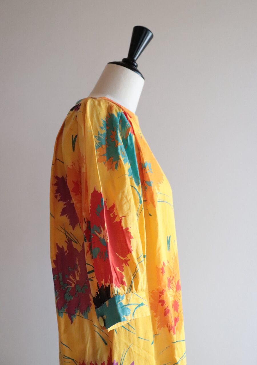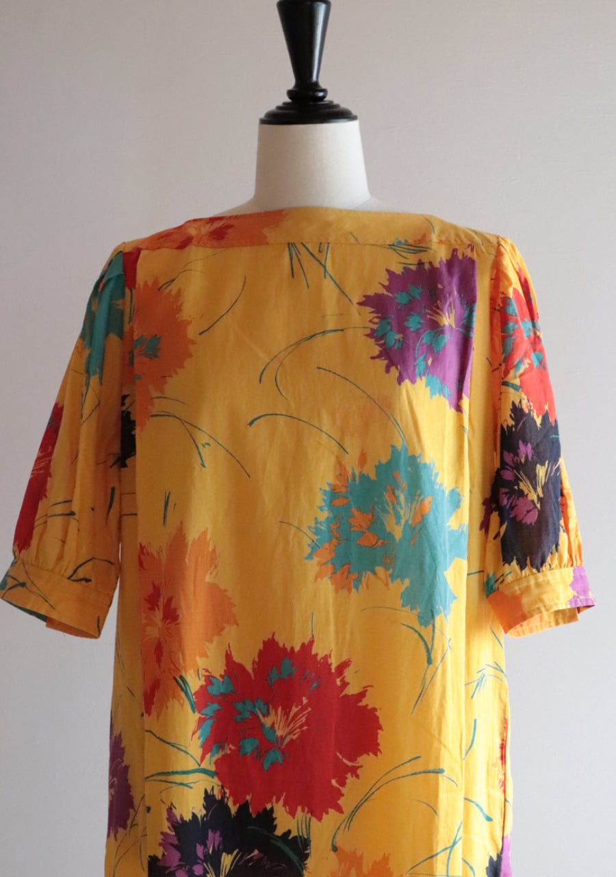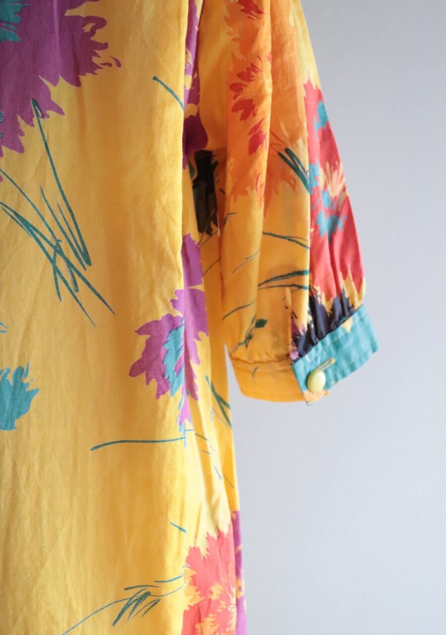 色鮮やかで大柄の花柄が可愛い!形がきれいで上品なシルエットです。透け感があり涼し気。レイヤードスタイルでも素敵です。両方ポケットがあります。