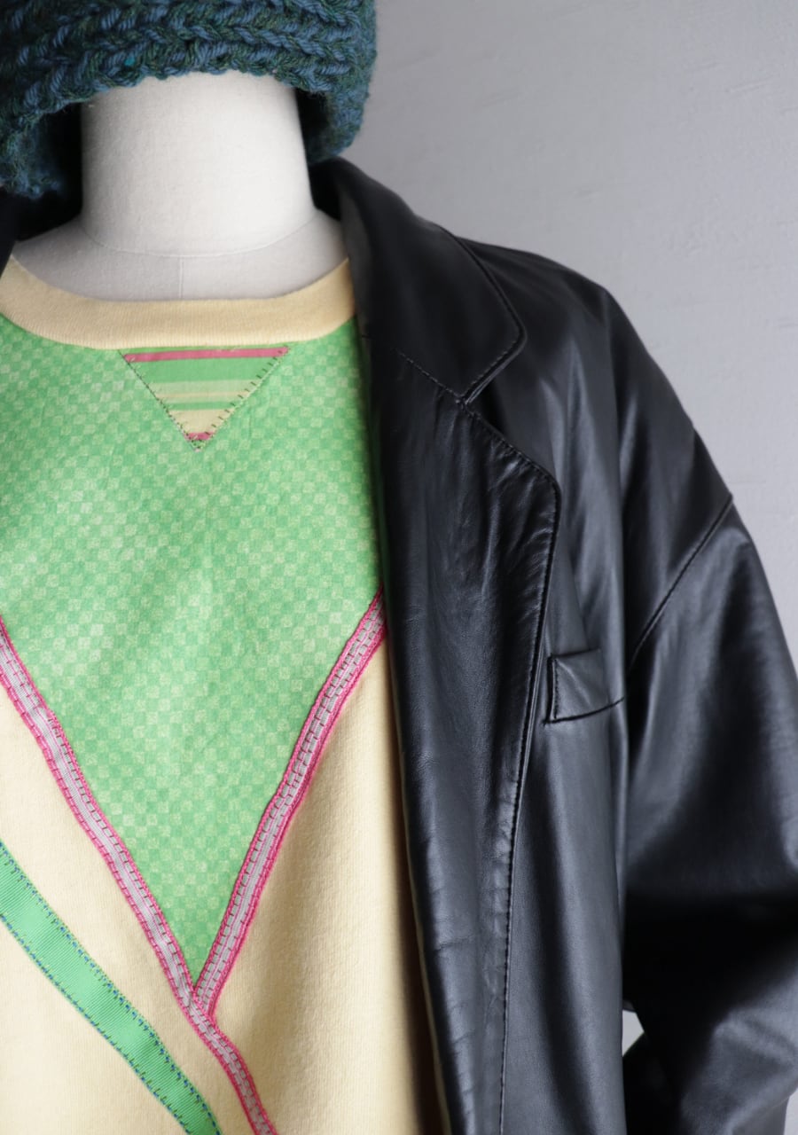 ゆったりとしたサイズ感。やや肉厚な生地感で裏起毛で暖かいです。胸もとのテーピングデザインが可愛い1着です。