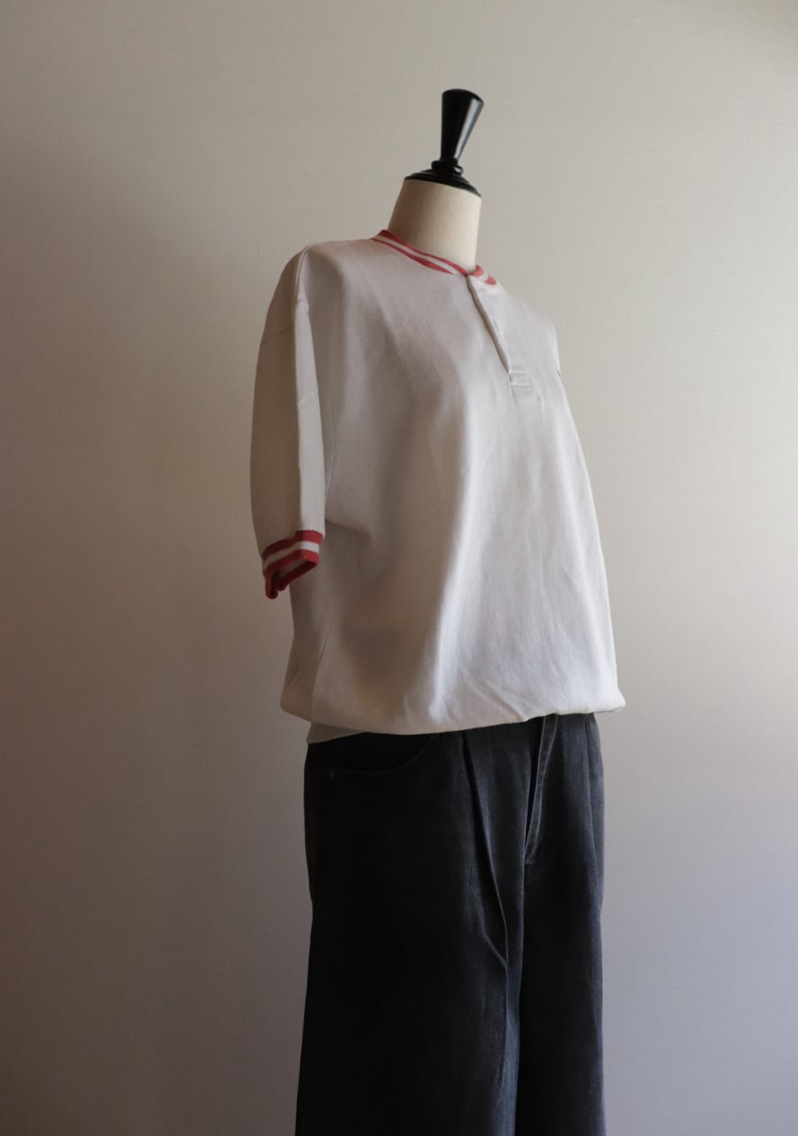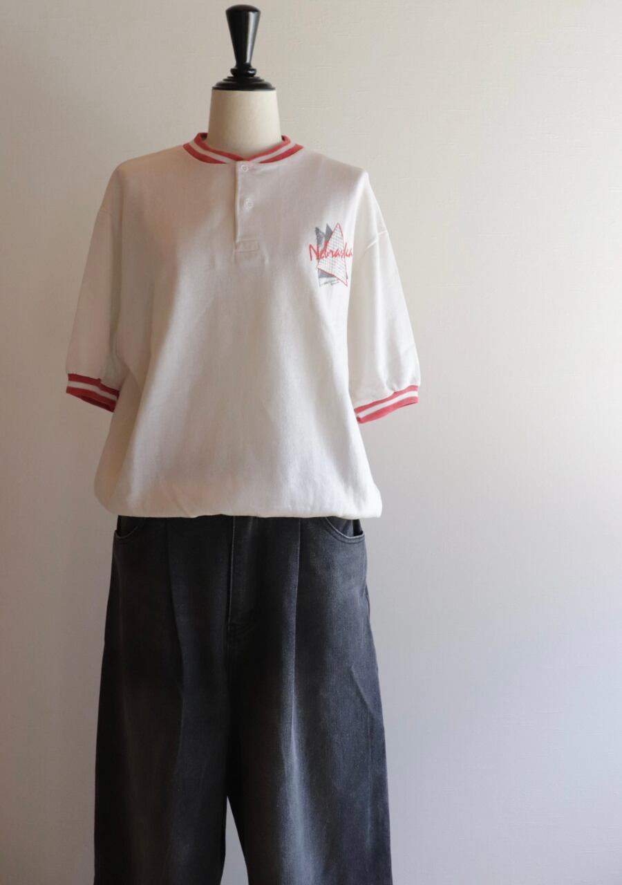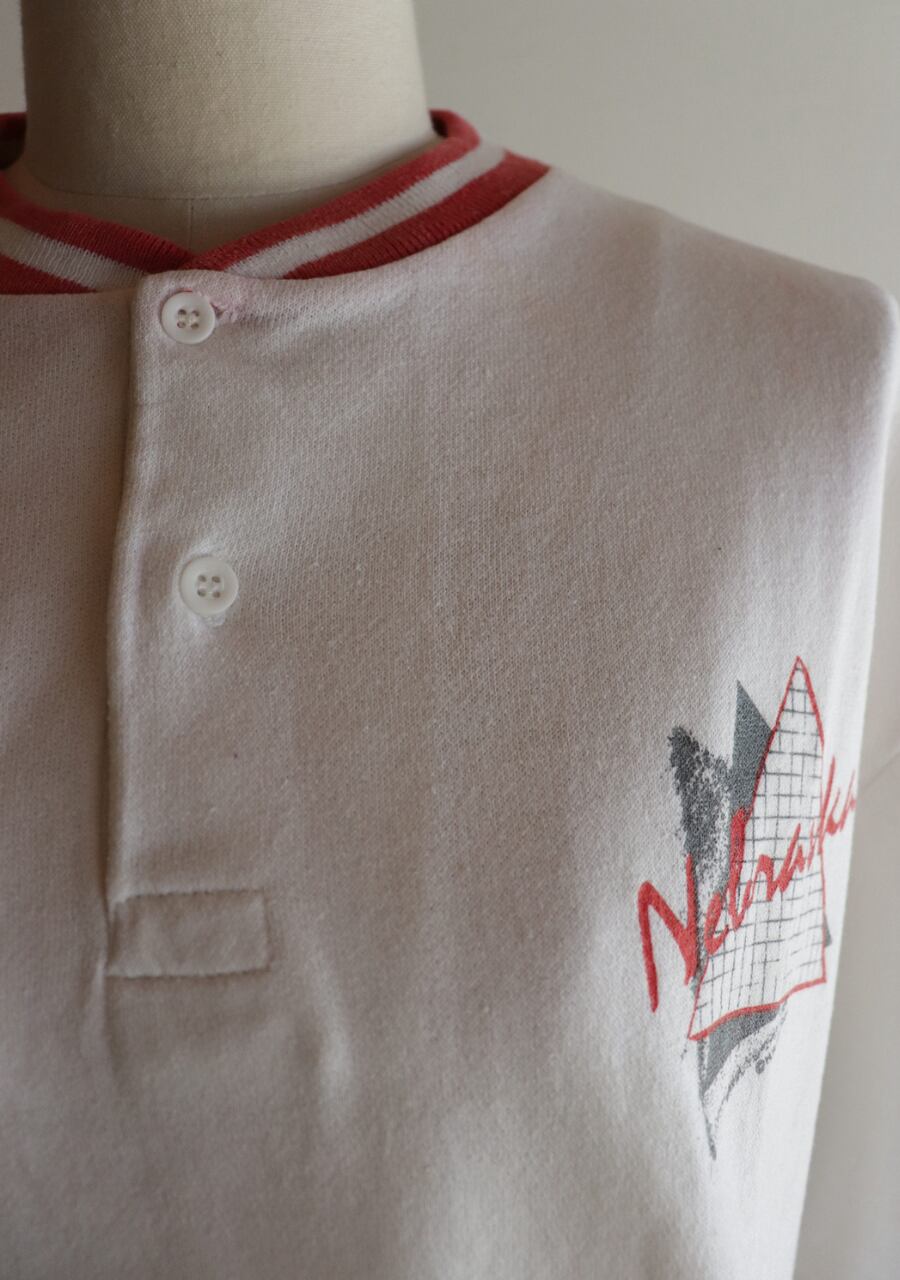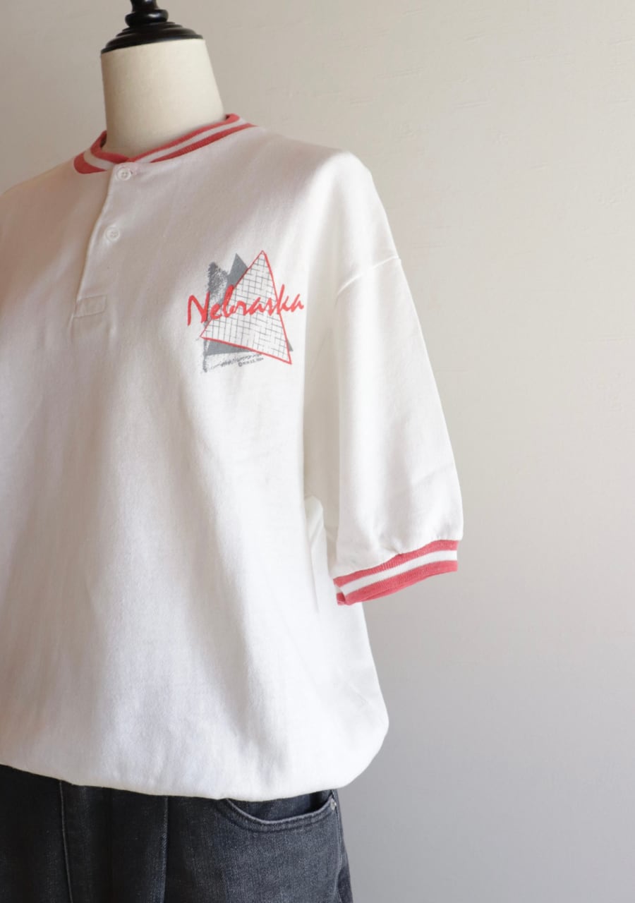 80s 首元袖元に程よい締まりのリブがあり、赤ラインがポイントに。首元のボタンで開閉することでまた違った着こなしが可能なデザインのスウェット。薄手でこれからの季節も爽やかに着用できます!