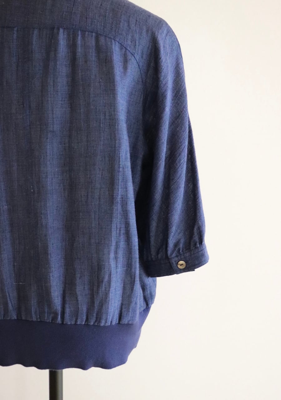 サイズ感も良い。涼しい麻のような薄手の生地。胸もとがポイントでポケットは無しのタイプです。