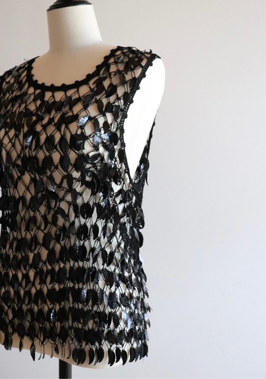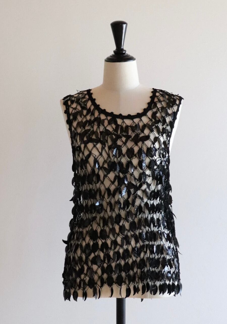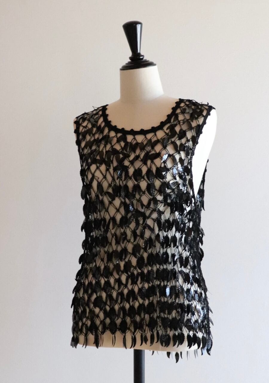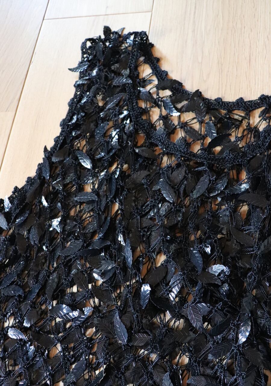 リーフの形のスパンコールが編み込まれたベスト。ギラつきがなく光の角度で艶感が出て大人っぽい。葉が風に揺れてカサカサと心地よい音が鳴るようにこのベストも音がします。とても可愛い♡