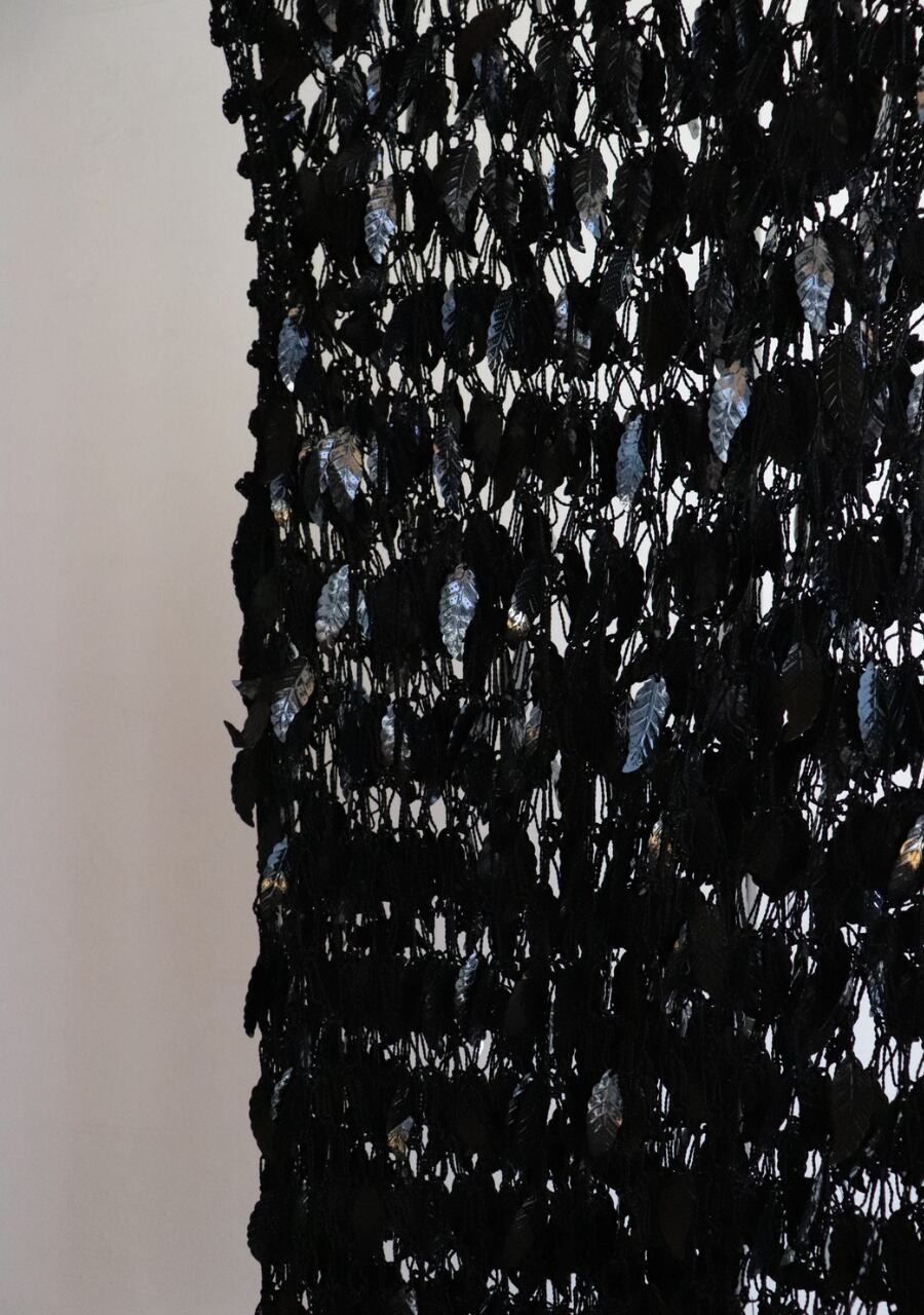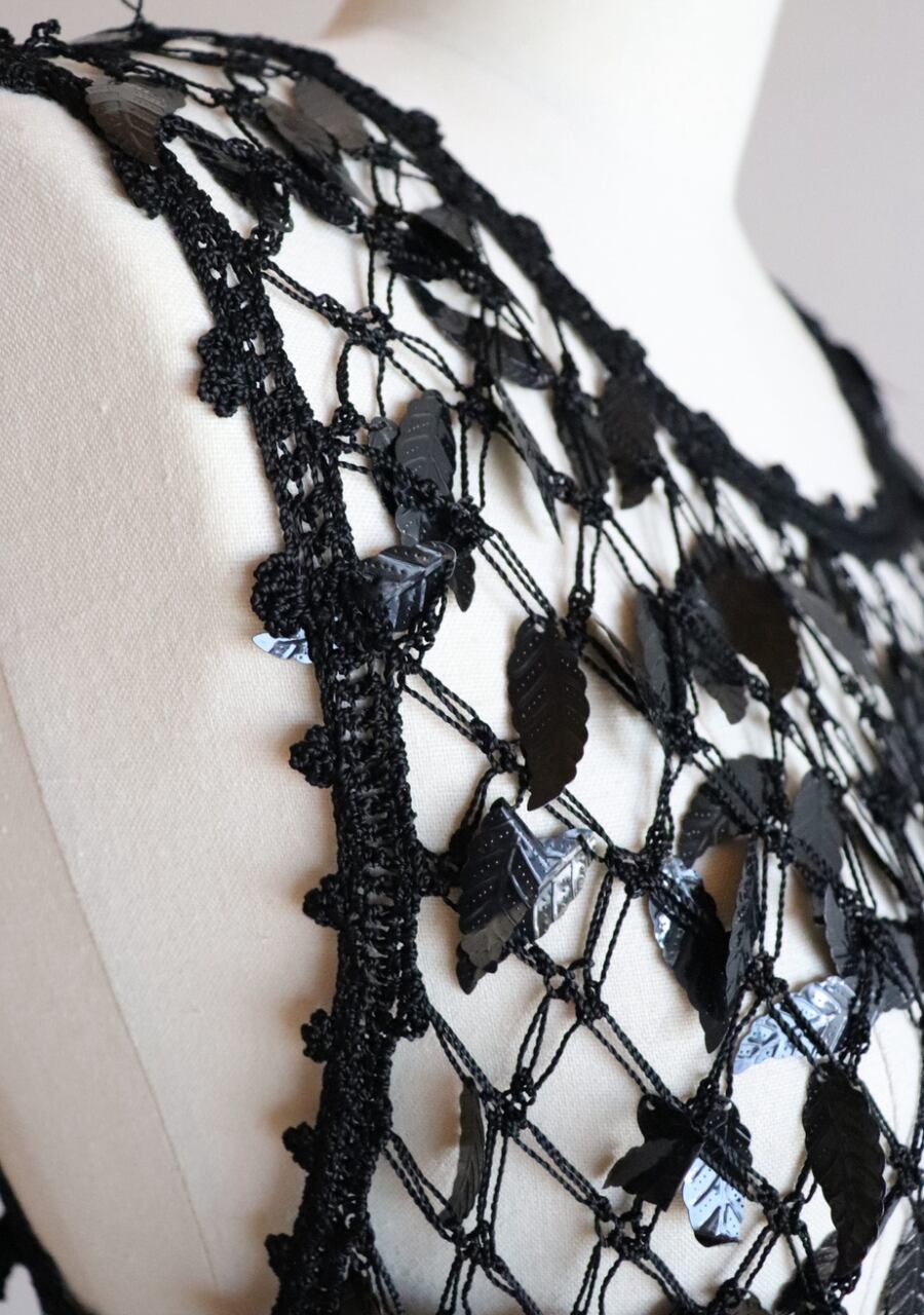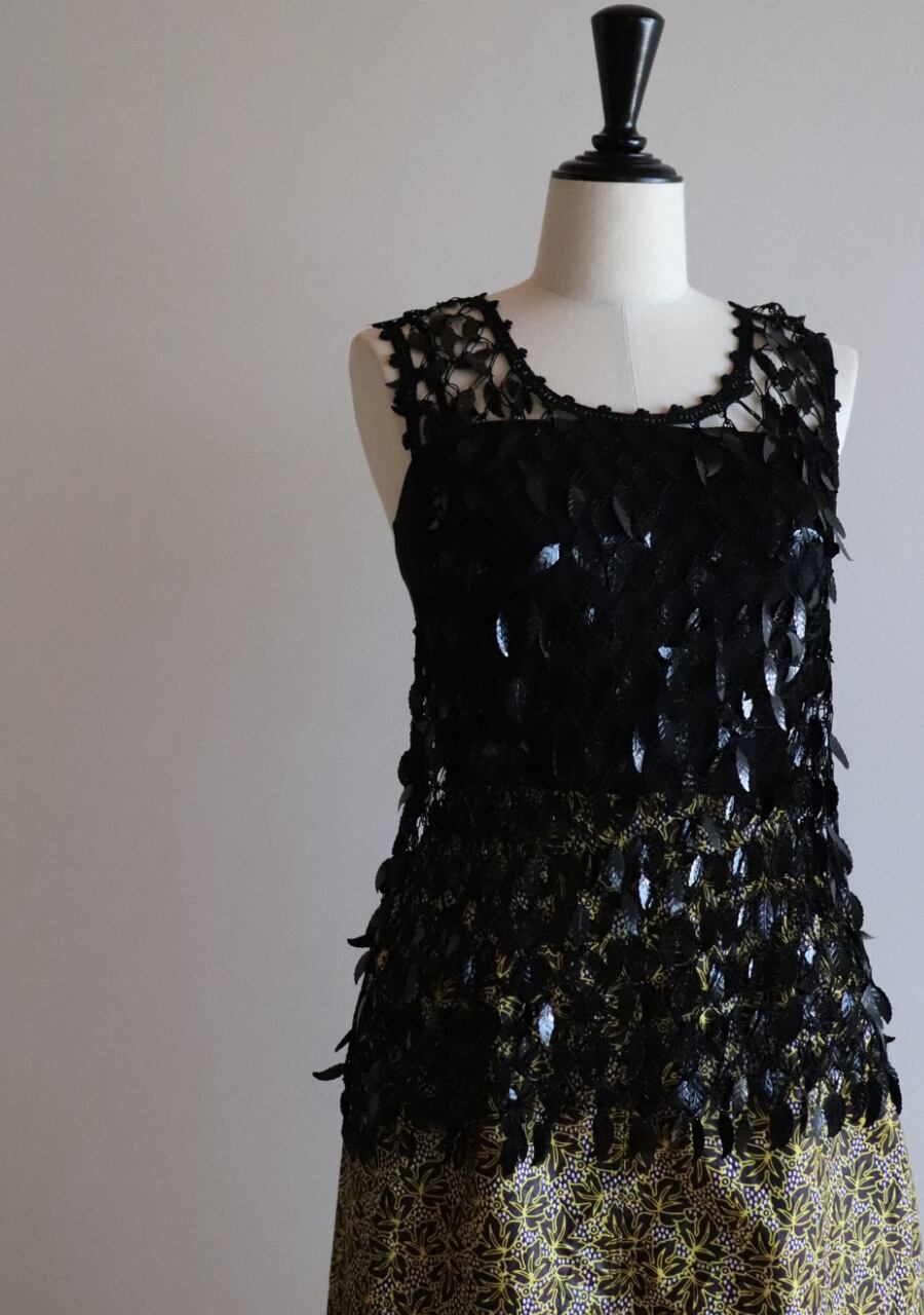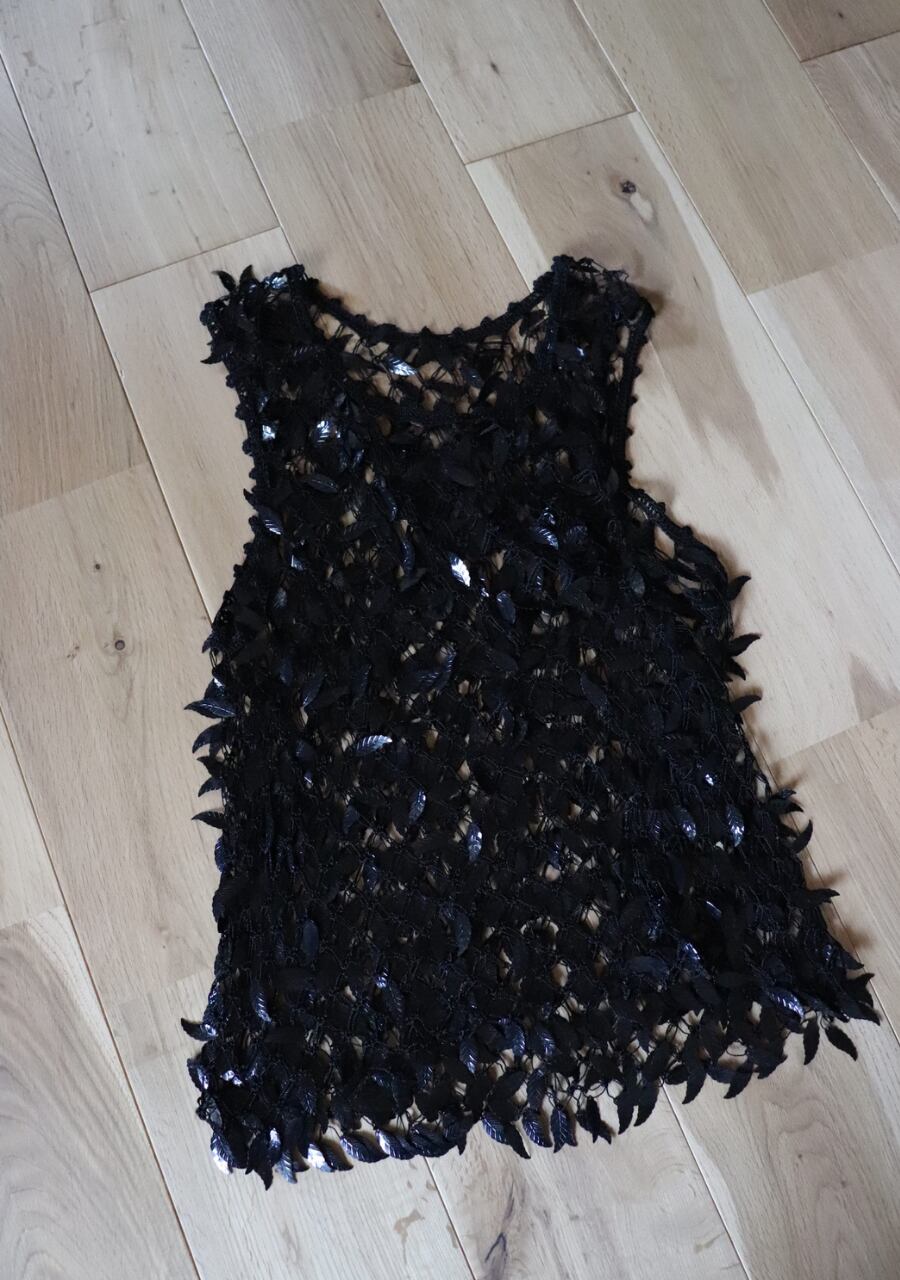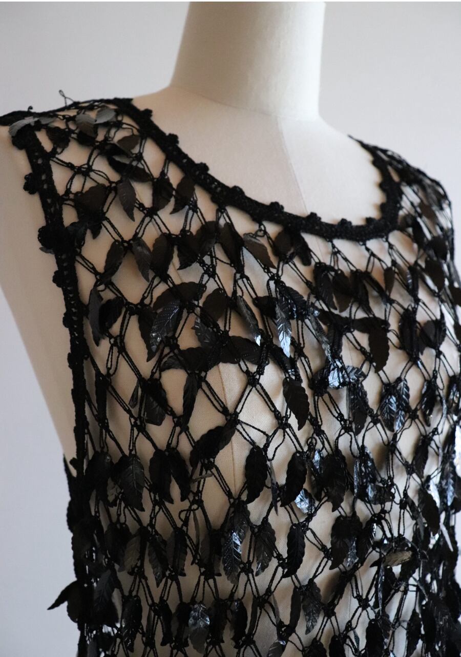 リーフの形のスパンコールが編み込まれたベスト。ギラつきがなく光の角度で艶感が出て大人っぽい。葉が風に揺れてカサカサと心地よい音が鳴るようにこのベストも音がします。とても可愛い♡