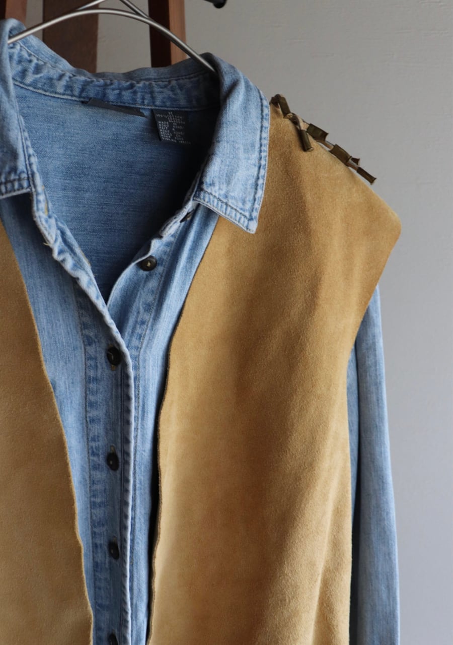 一見シンプルなベストかと思うがフリンジが存在感を放っていてかわいい。金具が重量感と高級感を出していて秋コーディネートの格上げアイテムとなります。重たすぎず程よい重量感が体にフィットします。色味も大変よく暗くなりがちな秋冬コーデも華やかに。Tシャツと合わせて、甘いドレスと合わせてなど今すぐから春先まで着用していただける一着です!