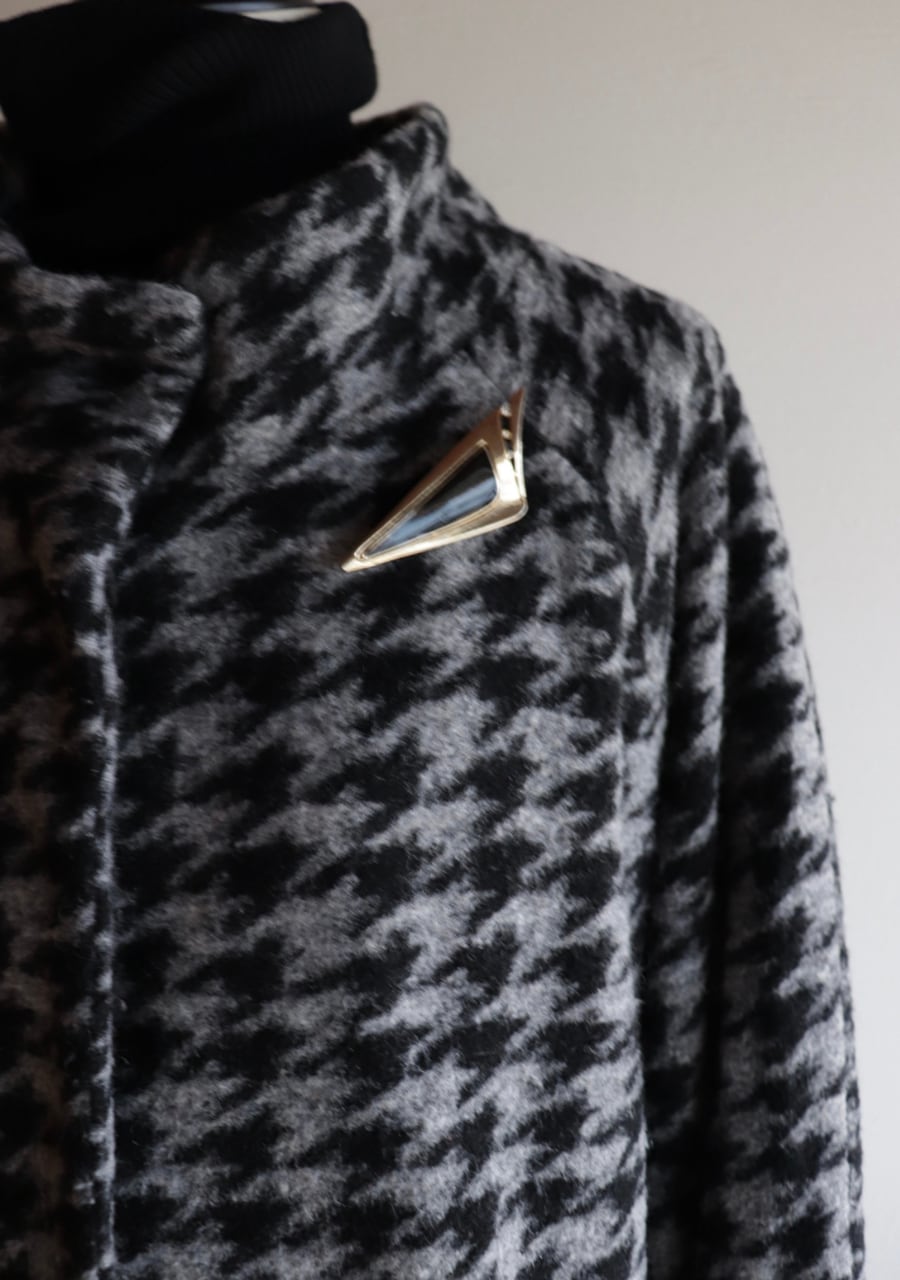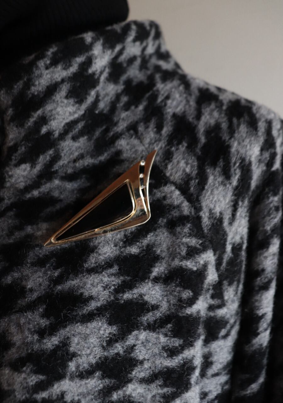 三角のブラックの石が置かれたシンプルながらも存在感のあるヴィンテージブローチ。キラキラとした小さなストーンがサイドにあり輝きが、身に着けるだけで特別な雰囲気を演出してくれます。どんなスタイルにも合わせやすいデザインで、その存在感はコーディネートを引き立てくれるアイテムです。